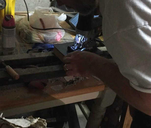 Para la letra D que necesitaba una manera de cortar el centro. Utilizamos una agujero Sierra para cortar un agujero. Entonces mi yerno ayudado por usar su sierra de calar para cortar el resto del centro. El resto de la carta corte con la sierra.