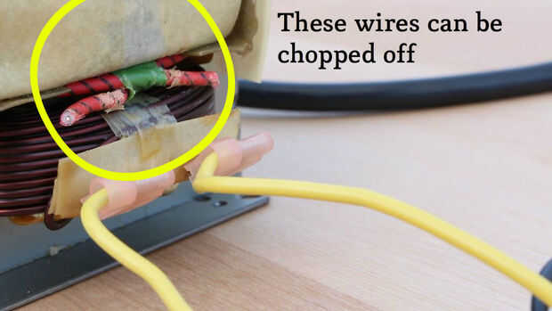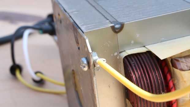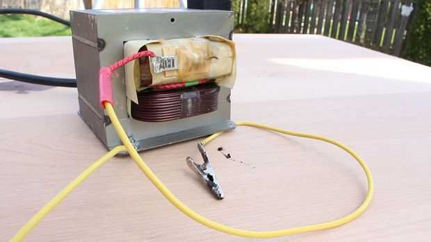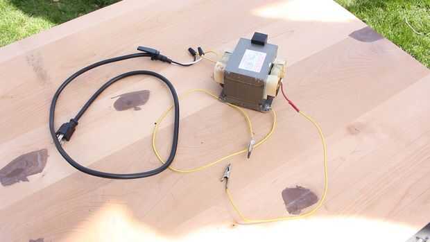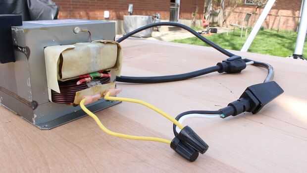 Una vez que tenga el transformador y el cable de poder quitar el transformador puede conseguir conectado hasta la manera que necesitamos. Hay dos bobinas en el transformador. La bobina primaria de 120V y la bobina secundaria de 2200V. El cable de alimentación que fue quitado del microondas necesitará estar conectado a dos terminales en el bobinado primario del transformador (no importa la polaridad).