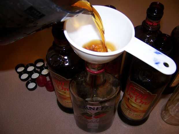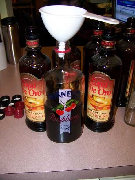 Mantenga a mano una toalla como esta puede conseguir desordenada a veces. Después de cada botella está llena, tapa firmemente y agitar para arriba. Tomar una pequeña muestra y ver cómo te gusta. Tenga en cuenta que el café es café barato y el alcohol de grano es muy fuerte, así que habrá algunos sabores fuertes y algo desagradables cuando el licor es joven, pero estos se desvanecerán después de un par de semanas. Si usted siente que usted necesita para ajustar los ingredientes, seguir adelante, pero asegúrese de ponerlo por escrito.