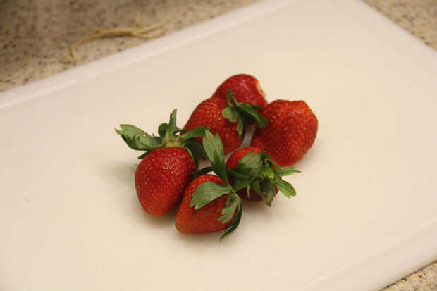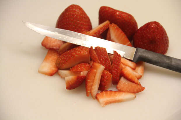 Si usted corta sus bayas o frutas hasta dependerá de la fruta. Cosas más pequeñas como arándanos o cerezas que probablemente dejaría todo. Corte estas fresas para intentar embalar más en la jarra.