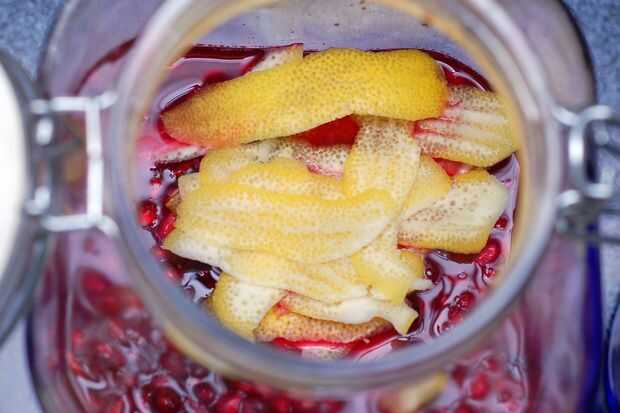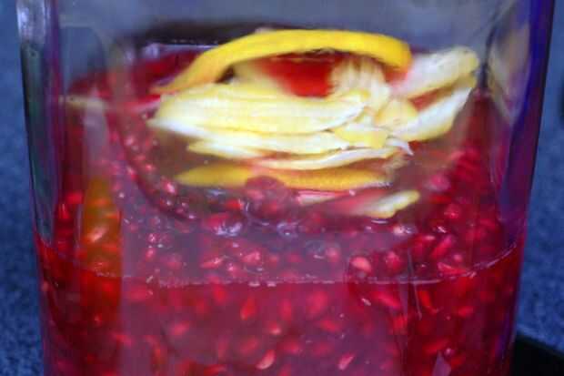 Añadir el zumo de Granada y semillas, la cáscara de limón y la canela.