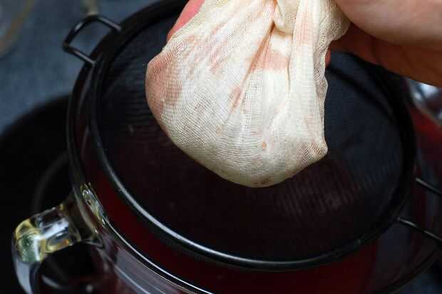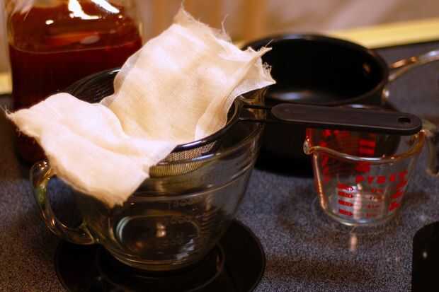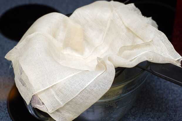 Colar con cuidado el líquido a través de varias capas de Gasa. Ayuda a humedecer la estopilla primero para que el líquido penetra más suavemente.
