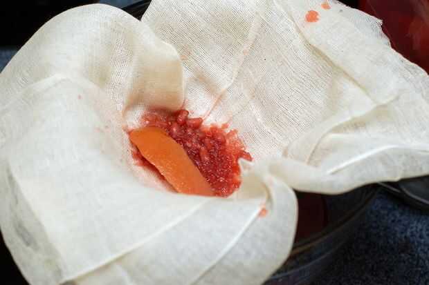 Una vez que llegue al punto de filtrar hacia fuera la pulpa y cáscara, retuerza suavemente la estopilla para extraer todo el líquido y el jugo (la cuarta foto).