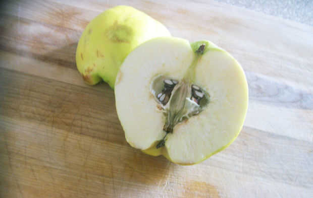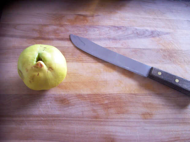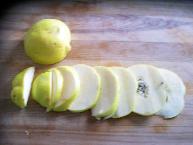 Vas a necesitar un cuchillo y algunas habilidades de corte en este punto. Membrillos tienen centros muy duros, así que tenga cuidado al cortar a través. Usted querrá rodajas finas para el licor - más superficie expuesta al alcohol, mejor. Asegúrese de cortar las semillas y medulares de los centros de sus rodajas. Tardé aproximadamente dos membrillos enteros para llenar mi cuarto de galón tarro-puede que necesite más o menos dependiendo del tamaño y cómo llevar su recipiente.