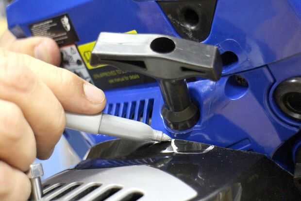 Al igual que con la parte superior, la interfaz entre la base de la licuadora y la parte inferior de la motosierra tiene contornos que pueden ser ranurados hacia fuera para hacer un ajuste más ceñido. Específicamente, la cuerda del tirón para iniciar la motosierra necesita espacio.
