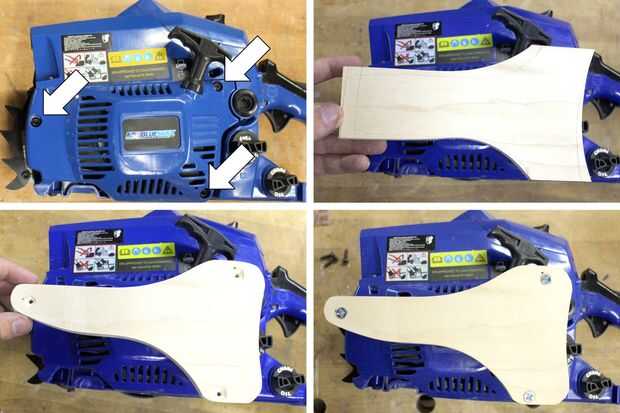 He identificado tres ubicaciones de los tornillos en la tapa de la bobina de arranque cable de tirón, las ubicaciones de los tornillos proporcionar la ubicación donde se utilizará nuevos tornillos más largos para conectar un nuevo soporte madera para sostener la licuadora a la motosierra.