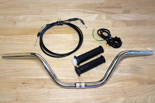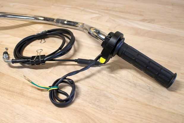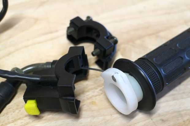 Elegí tener la motosierra funciona mecánicamente con un cable de acelerador de la motocicleta. Este montaje de la válvula reguladora se monta fácilmente: el extremo knuckled del cable del acelerador se inserta a través del conjunto de montaje y en la parte dentada de la empuñadura. El apretón de la mano con el cable del acelerador puede instalarse en el lado derecho del manillar, y luego el montaje del acelerador instalado alrededor de la empuñadura del acelerador.