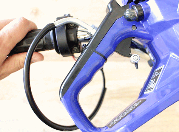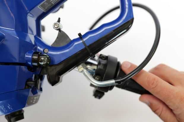 Esta motosierra tiene también una seguridad que requiere su mano para presionar una palanca con la palma de su mano para tirar el gatillo. Esta seguridad fue superada con una amarra alrededor de la manija que mantiene permanentemente la seguridad apagado.