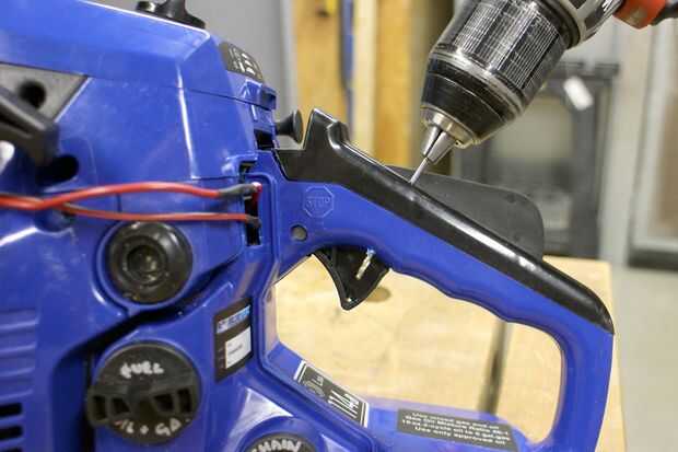 Una esperanza pequeña fue perforada a través de la manija de la motosierra y el gatillo. El hardware de montaje para el final de la válvula reguladora fue enroscado en el mango de la motosierra. El cable del acelerador cuidadosamente fue pescado a través de la empuñadura y el gatillo y la herida alrededor de un pequeño tornillo con una tuerca que aprieta en el extremo de sujeción del cable del acelerador.
