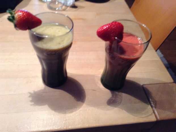 mi hermana y yo habíamos pasado la tarde preparando licuados de zanahoria.Muchos fracasados batidos más tarde que llegamos a estos dos:Su receta (fotografiado)"Regocijan de los amantes de la pasta" *Mezcla hasta liso:10 zanahorias5 fresas congel