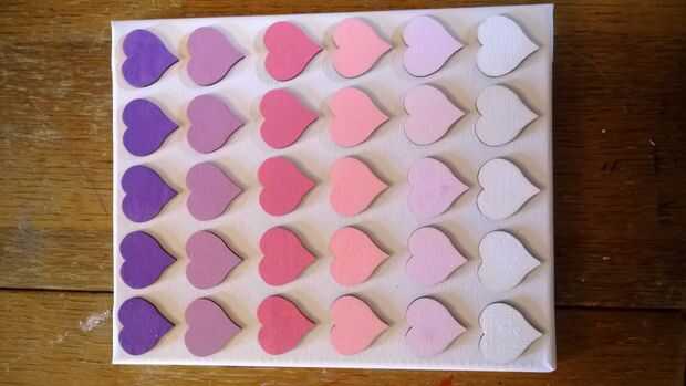 El bit siguiente toma un poco iluminado de paciencia para hacer bien. uno del grupo de color en un momento pone hacia fuera una línea sobre el lienzo igual espaciados y hacerlo con todos los harts en hasta que el lienzo esté completo. palo abajo en este punto aún no como necesitemos mantener ajuste ligeramente la posición de los harts en allí hasta todo uniformemente espaciados.
