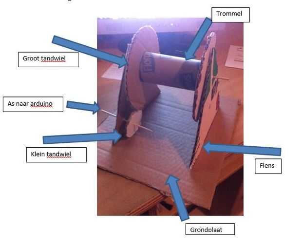 De lier werkt puerta middel van 2 tandwielen. Het grote tandwiel drijft de la criba aan waar de kabel omheen zit. Het kleine tandwiel drijft het grote tandwiel. Het kleine tandwiel wordt aangedreven puerta middel van een como die aan de arduino bevestigd es.