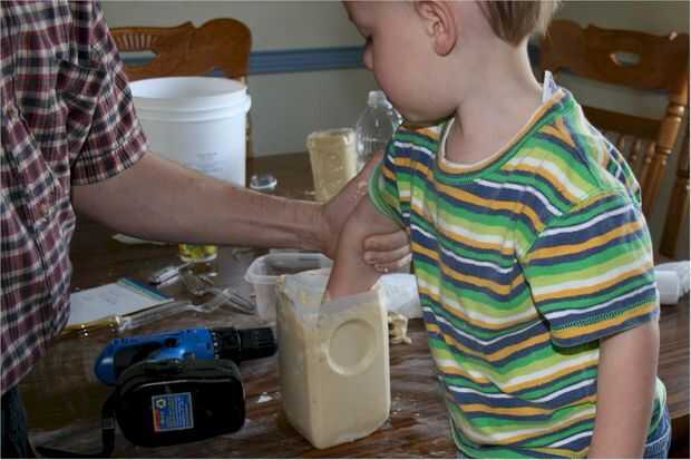 Pelo corto no es típicamente un problema, saca fácilmente del molde, pero si el modelo tiene mucho pelo o pelo grueso en la parte que los moldeados pueden considerar el uso de un compuesto de liberación del molde para evitar molestias y molde rasgado, como un poco de vaselina. Las manos más adultas y los niños no tienen este problema, pero tenga en cuenta. También tenga en cuenta que los anillos están duplicados, pero algunos anillos romperá el molde durante la extracción. Usted podría tratar de hacer que el niño sostenga un objeto (pelota, juguete bloque) o moldeado con un anillo, pero dejando el anillo en el molde. Estos objetos o pueden extraerse del molde y ser replicados por el compuesto de bastidor, o puede dejarlos en el molde para formar parte del casting, como anillos y las bolas pueden ser difíciles de poner en su lugar en una fundición endurecida.