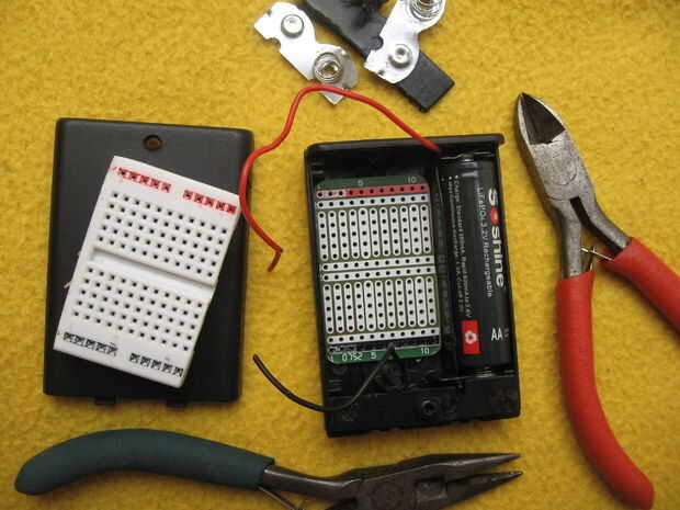 caso, que está formado por un parcialmente vaciada 3 x AA la célula batería conmutada titular! Circuito está montado sobre un protoboard sin soldadura en rodajas, mientras que un diseño "Kiwi" adapte a una versión final de soldado. Energía es a través de una célula recargable de LiFePO4 V (litio hierro ha) AA tamaño