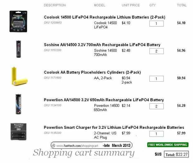 Mi selección de celdas y cargador LFP dedicado inicialmente fueron obtenidos de una empresa especializada de Nueva Zelanda, pero observaron a precios mucho más barato mediante importaciones directas de los enchufes de Hong Kong que se centran en las ventas de batería global. Aunque sobre para flete aéreo internacional, comentarios de los aficionados de radio controlada avión indican tal batería de litio directo pedidos llegan afortunadamente en embalaje de protección muy resistente. Aquí le damos la orden - post gratis - para 6 celdas, 2 maniquíes de placeholding y un cargador inteligente de la LFP! Llegó una semana más tarde sin problemas aquí en Nueva Zelanda. (Tenga en cuenta que China y Nueva Zelanda beneficioso tengan un acuerdo de libre comercio)
