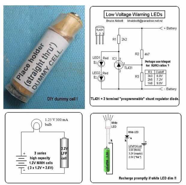 * Estado batería podría controlarse mediante un DMM (Multímetro Digital) o incluso un LED blanco (que es brillante en 3.6V, atenúa < 3V & va por 2.5V). Enfoques más sofisticados usando un diodo regulador ajustable (TL431, etc) también pueden tener kilometraje.
