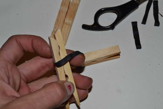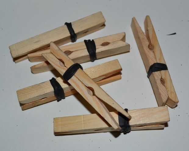 esto es cómo hice mis pinzas, con palillos usados.Pero si usted re acampando puede utilizar pedazos de palos. (SERÁ REALMENTE ÚTIL EN DÍA DE VIENTO!).o puede usar caña de jardín.Usted puede ajustar el anillo de goma que se cuelgue su ropa.Paso 1: Lo