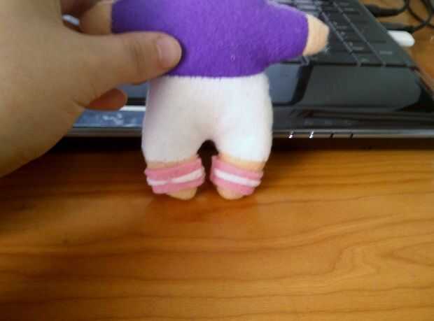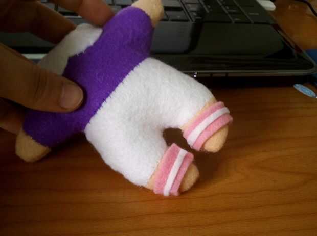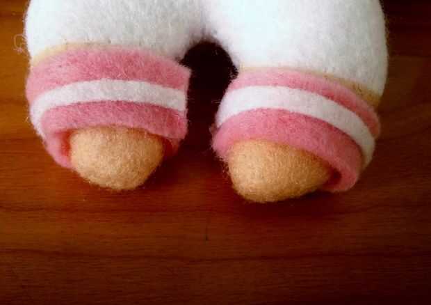 Muy bonito tienes una tira al azar de fieltro rosa y había cosido una tira blanca más delgada en el centro. Luego lo cosí en la parte inferior de su pierna. Y eso es todo por eso :)