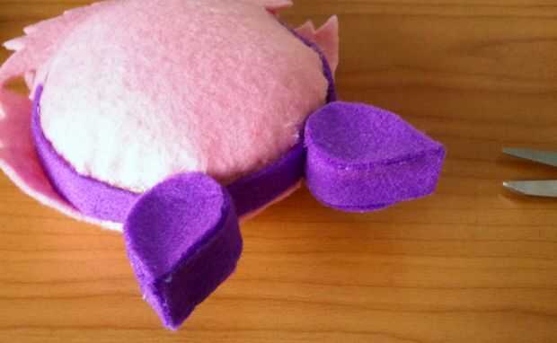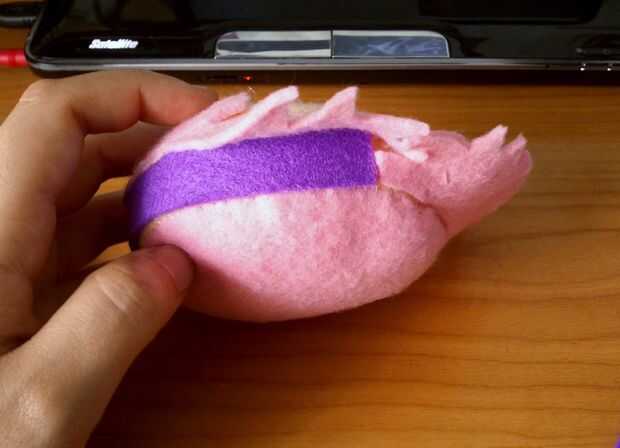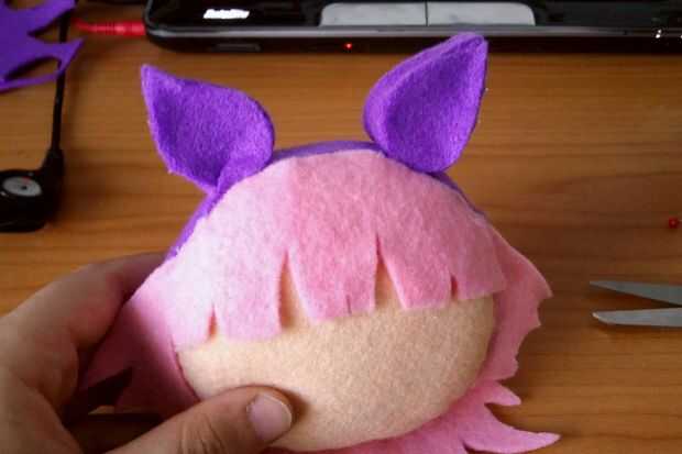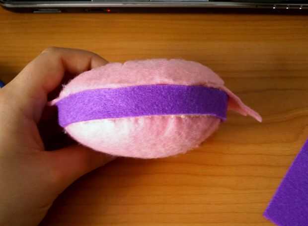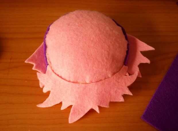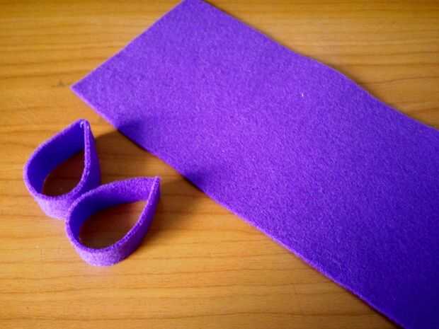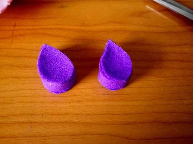 Para cubrir el borde amarillento en la cabeza podría hacia fuera una tira de fieltro morado para actuar como una diadema. Entonces conseguí gruesas tiras de fieltro morado para hacer las orejas. Éstos eran muy fáciles - me la tira y pega caliente las puntas en forma de gota de té. Entonces trazó la forma de lágrima en púrpura fieltro y cortar cuatro formas de lágrima sólida. Luego caliente pegué a la franja morada para hacer el resto de la venda.