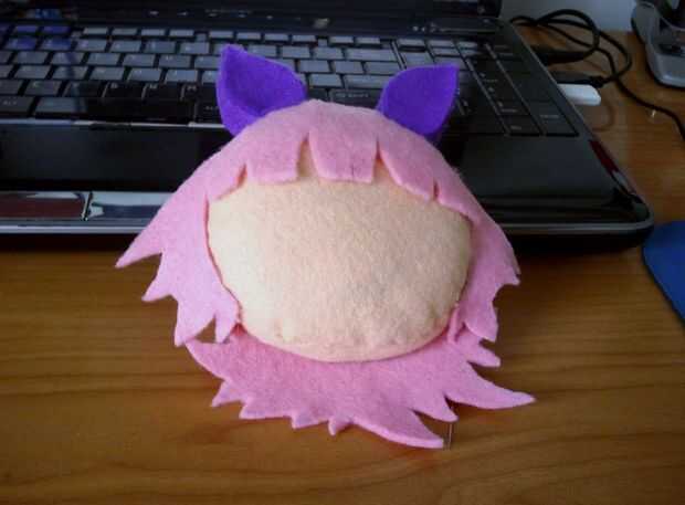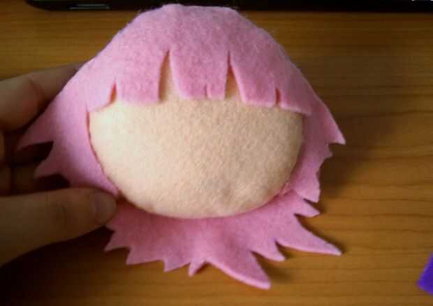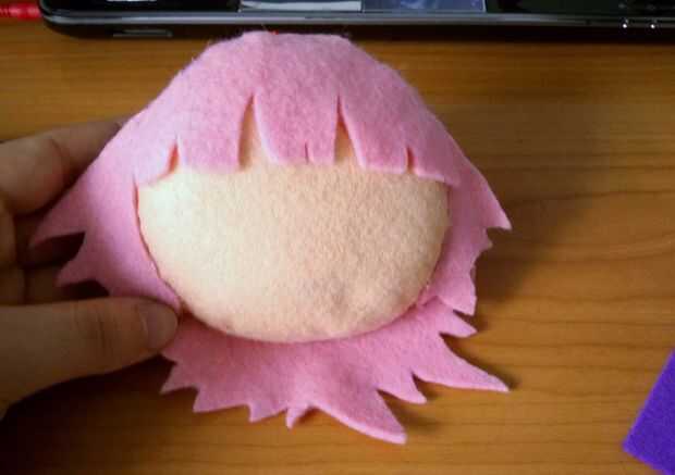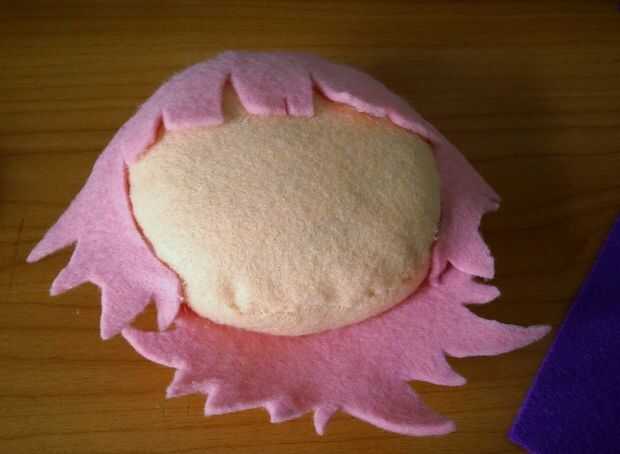 Yo no el documento esta muy bien. Probablemente habría sido una buena idea para hacer el pelo, sin embargo básicamente sólo hacía montones y montones de pequeñas tijeras en trozos grandes de pelo. Habría ahorrado me algunos fieltro si dibujaba un patrón y entonces comenzó a cortar lejos. Realmente no fue tan difícil. Acabo de hacer el pelo en pedazos, he guardado algunos fieltro mediante el círculo de color de rosa para el pelo como hice pelo para caber alrededor del círculo.