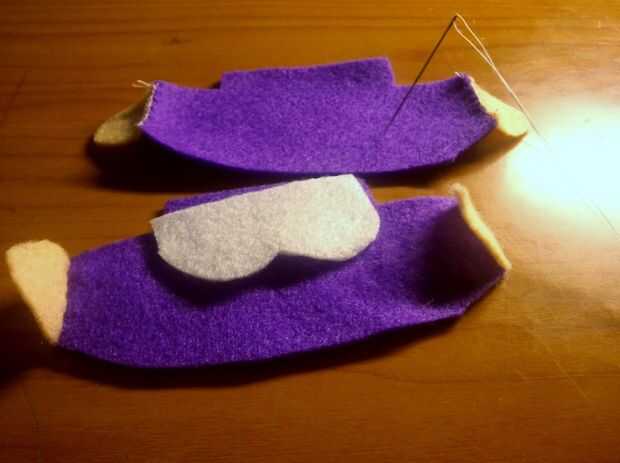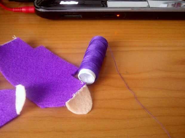 Por último utiliza el patrón para cortar cuatro piezas de mano beige. Manta de coser a las mangas en las piezas de cuerpo púrpura.