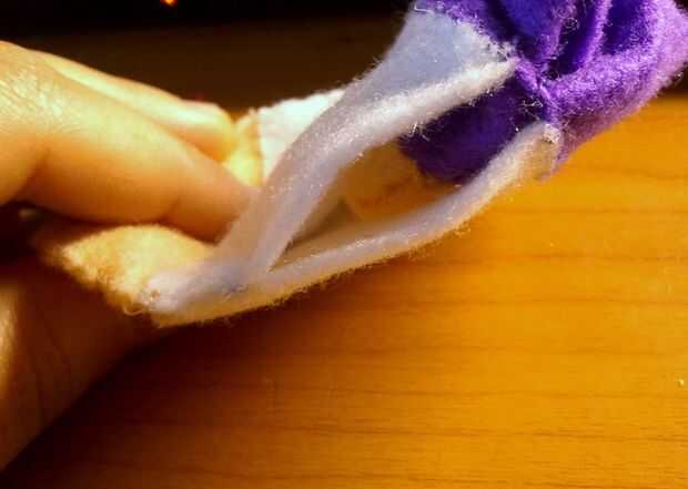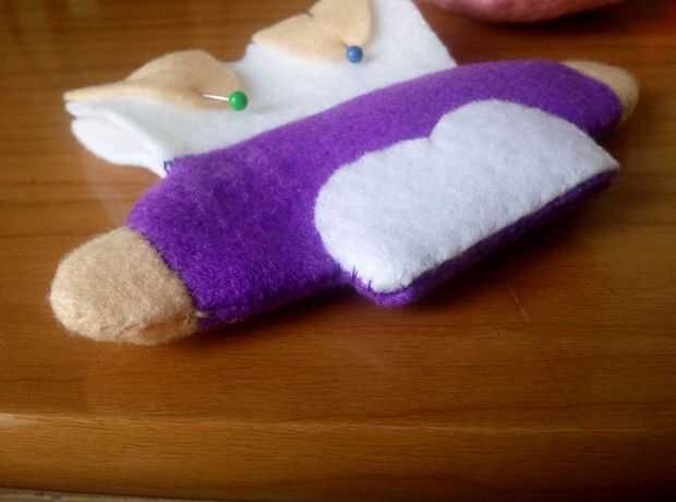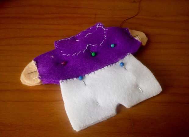 Uso el correspondiente sentido dependiendo del color donde coser (púrpura de la parte superior del cuerpo, blanco para los pantalones, etc.).