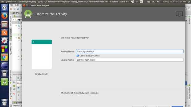 En la siguiente pantalla ingrese el nombre de la actividad como FlashLightActivity y no olvide verificar el botón de diseño generar y a continuación, haga clic en finalizar.