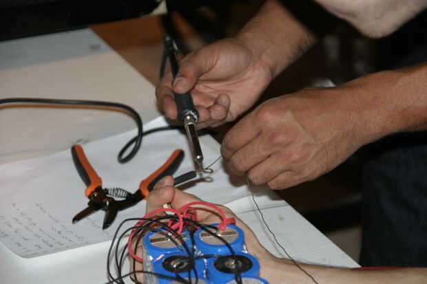 Una vez que todas las piezas se unen, comienza los cables juntos. Ser muy cuidadoso con mantener un cable de la batería con cinta sobre hasta el final. No hay mucho que podemos decir aquí, sólo mantener un ojo sobre los esquemas y probablemente tendrá que voltear la polaridad del motor. Cablear un interruptor entre el final de la batería de plomo y el regulador, junto con el interruptor de matar procedentes del controlador. Hemos aprendido la manera dura que llave del controlador sólo cortes de gas de entrada y no rompe el circuito.
