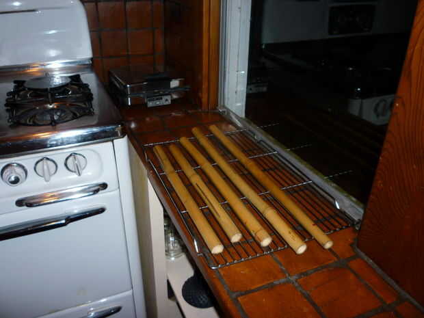 Antes de tratamiento térmico, es importante la rotura de las membranas interiores del bambú con un trozo de varilla. Si no haces esto el bambú se agrietará y podría explotar. También, grietas existentes aumentarán de tamaño durante este proceso. Hay dos formas de tratamiento de bambú. El primer método consiste en poner el bambú en el horno. Este es el más fácil, el más rápido, más seguro y la forma más barata, pero no todas las piezas de bambú se ajusta a menos que usted tiene acceso a un horno muy grande, o decide hacer un horno. Si utilizas un horno, la temperatura a 350 grados Fahrenheit y poner el bambú en de como tiene que ser ligeramente doradas. Es difícil decir cuánto tiempo éste tomará, pero tardó unos 40 minutos para nosotros. Ayuda para girar las piezas cada 10 minutos o menos. La segunda opción es usar un soplete o una pistola de calor eléctrico. Sugerimos una pistola eléctrica, porque el calor no quemará el bambú tan fácilmente como el soplete. Si haces esto el acabado en el bambú se verá más bonito, pero no será tan exhaustivo y el proceso de tratamiento de calor toma mucho más tiempo.