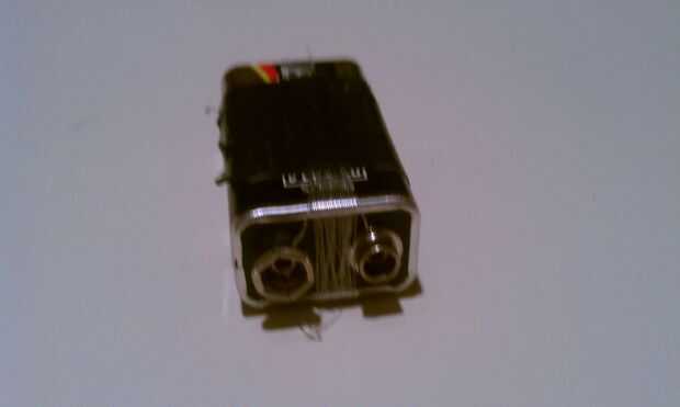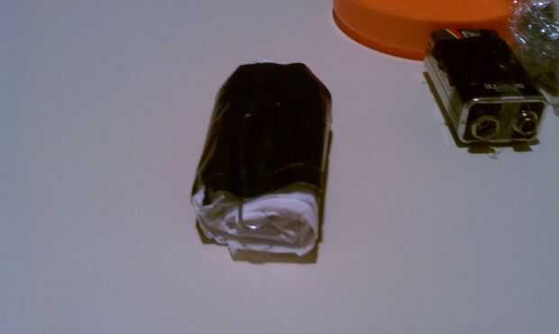 Doblar la bolsa de basura tan ajustadamente como sea posible y envolver en cinta aislante para evitar que no plegable. poner la lana de acero en un pequeño trozo de seran wrap o una pequeña bolsa de plástico. Luego tomar los 9v y enrolle el sedal alrededor de él y asegúrelo con cinta adhesiva.