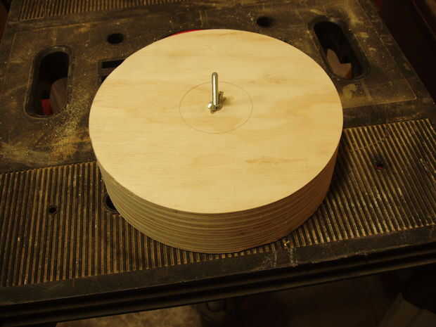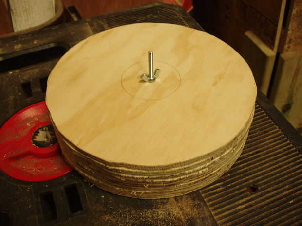 Esencialmente, he usado un taladro y perforar hacia abajo directamente a través de la "X" que lo dejé los puntos centrales de mis círculos. Desde aquí, he insertado un tornillo que era del mismo tamaño que el agujero y añadido una tuerca de mariposa que, cuando se aprieta, alineados todos los "círculos". Desde aquí, empecé a hacer pases con la lijadora de disco. El truco aquí es mantener la pieza en movimiento, girando contra el disco de lija.
