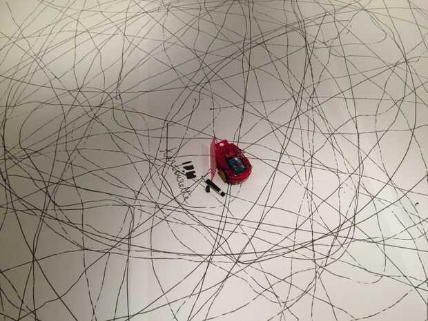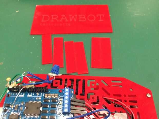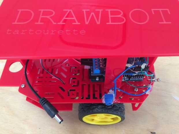 Decidí usar el mismo plexiglás rojo como el chasis para mantener una cohesión. Me lasercut y grabado el nombre de este proyecto "Drawbot" y mi nombre (tartourette). También corté un rectángulo pequeño para fijar la parte superior a una cierta altura (8cm en mi caso). Usando el pegamento duro había fijado les en forma equilibrada.