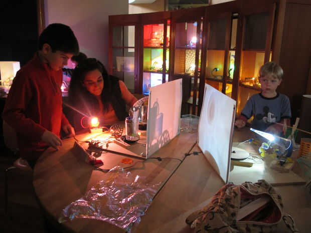 Esta actividad trata de desconcertante lo que "hacer arte" significa y parece, y quien puede hacerlo, utilizando materiales familiares que crean efectos desconocidos y sugerentes, y manipulando un elemento que está literalmente en todas partes: luz sí mismo.