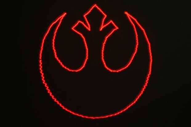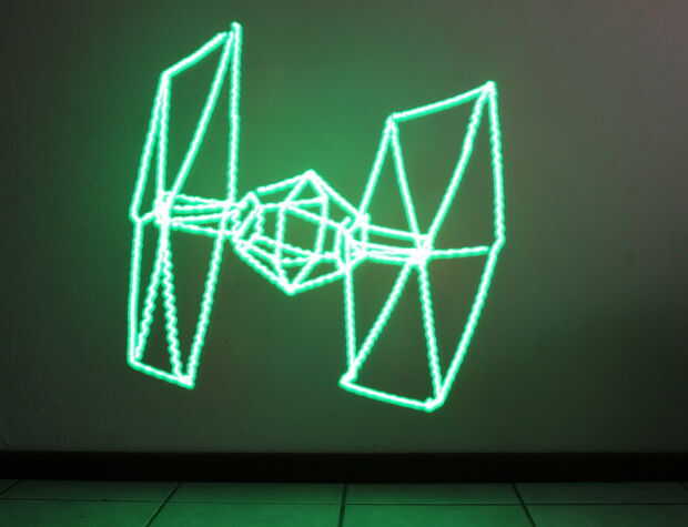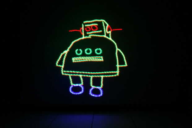 El RGB led está suspendido de dos cadenas, el otro extremo de cada uno se envuelve alrededor de una polea de un motor paso a paso. Por acortamiento o alargamiento de las cuerdas, el LED puede colocarse en cualquier coordenadas X, Y entre los dos motores.