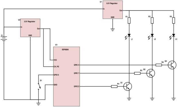 Los pines GPIO ESP8266 no fuente/sumidero suficiente corriente para los LEDs en el brillo completo (sobre todo si queremos que varios LED por color), para que construir un transistor simple circuito donde el pin GPIO activa un transistor de la conmutación y el transistor permite actual a través del LED.