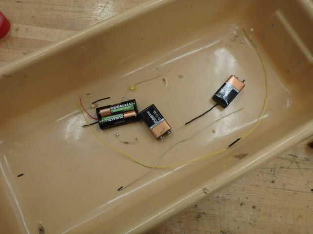 Usando un cautín, soldadura su LED a una batería de 9 voltios y la resistencia adecuada. Luego, inserte el LED y la resistencia en los agujeros que ha perforado en el modelo anterior, dejando la batería colgando fuera del cohete. Don'