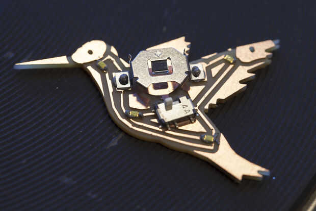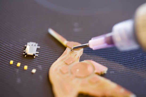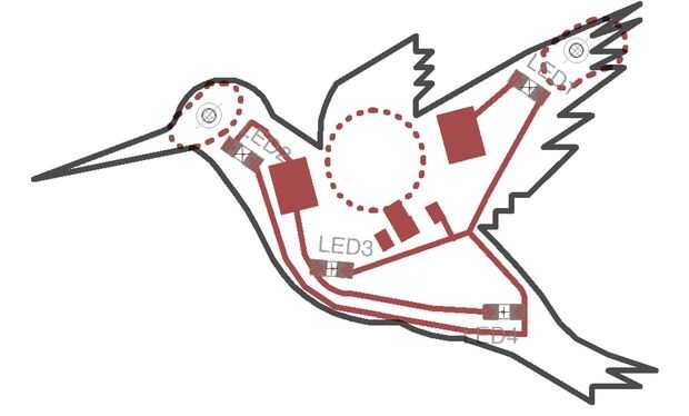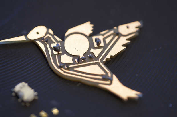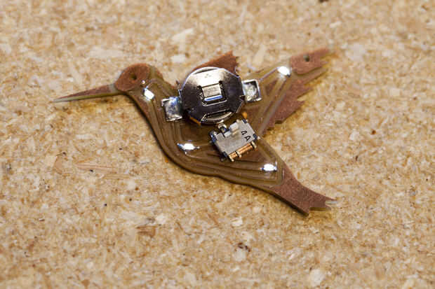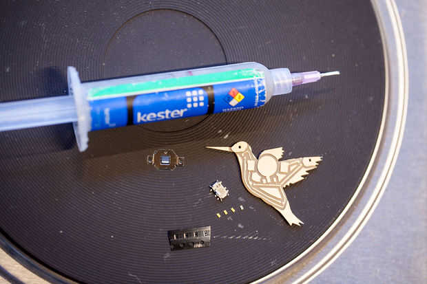 Ahora que haya terminado de cortar los circuitos de Colibrí, es tiempo para soldar los componentes electrónicos. Tiene 4 LEDs muy pequeñas, un interruptor y un clip de la batería que necesita para soldar.