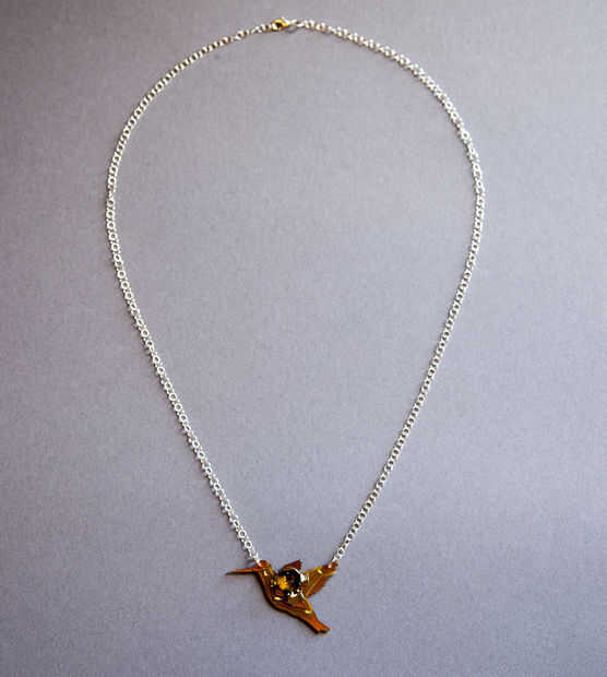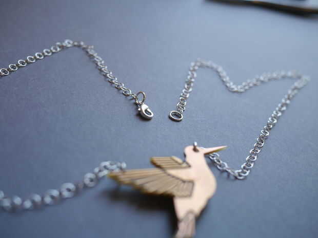 2. Pase un anillo a través de uno de los extremos de la cadena y el otro extremo a través del orificio en el ojo o la cola del colibrí. Ahora utilice sus alicates para torcer el anillo cerrado. Hacer lo mismo con el otro aro.