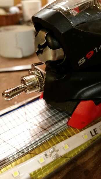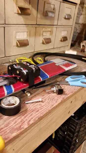 1. use cinta aislante adhesiva o para temporalmente la cinta cada parte a la estación de esquí: Ponga el interruptor en el frente vinculantes, el LED grande debajo de la espalda (si elige hacerlo) y la batería en la parte posterior de la estación de esquí.