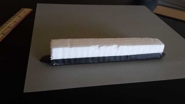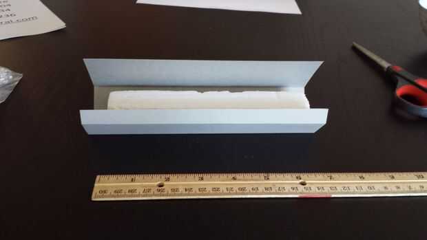 Para cubrir el exterior de aspecto desordenado, doblar y pegar un rectángulo de espesor (sí, grueso es preferible crear un bloque fuerte, ladrillo-como) cartulina alrededor de él. Sólo rodar la espuma de poliestireno en él hasta que has ido a 360 grados, añade 1-2" y recortarlo. Hacer aproximadamente una pulgada más larga que la espuma de poliestireno (no va más de una pulgada, o el siguiente paso va a ser difícil).