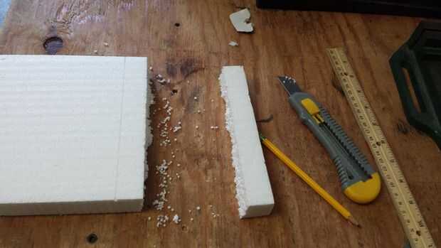 Para comenzar a crear la base, agarra la espuma de poliestireno (tenía algunos de cuando mi compañero compró muebles) y corte dos cuñas. El tamaño depende de su preferencia; Asegúrese de que va a ser lo suficientemente alto como para cubrir sus LEDs y un poco (~ 1") de la hoja de acrílico, y que es un poco más largo que el acrílico. Yo solo corte un rectángulo de 1"(y fue 1.2" de espesor).