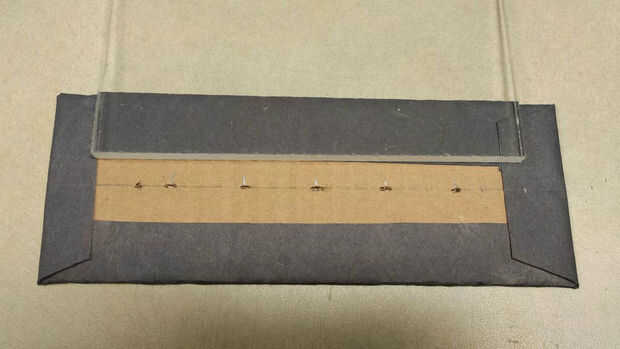 Marque una línea que recorre la mitad del mismo y marque donde descansará tu acrílico (centro de la hoja de acrílico y marca los bordes). Luego divida esa longitud entre 7 y marca de seis muescas de ese cálculo (suponiendo que usas 6 LEDs; usted puede cambiar ese número, por supuesto). Para mí, dividí el acrílico 15cm por 7 para obtener ~2.14 para que marque las muescas en 2.14, 4.28, 6.42, etc..