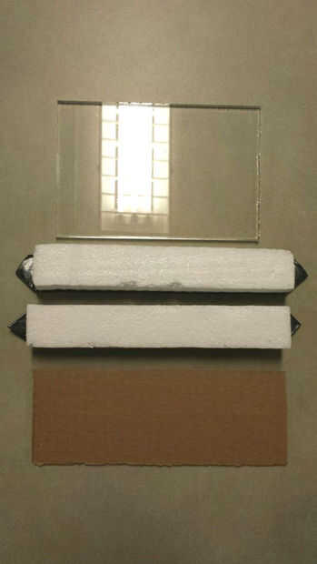 Cortar dos rectángulos de cartón que se ajuste a ambos bloques de espuma de poliestireno y la hoja de acrílico intercala en su superficie. Aparte de un puesto para más tarde y la otra con papel de construcción.