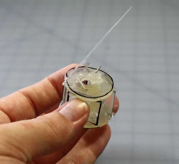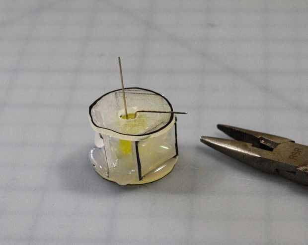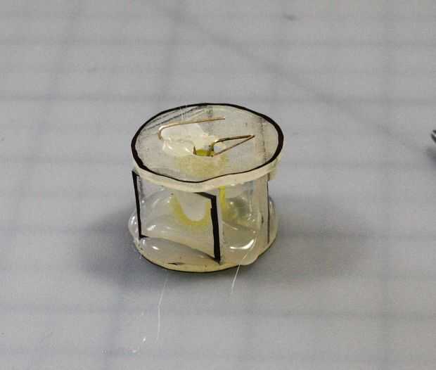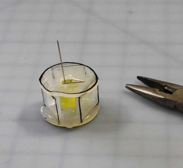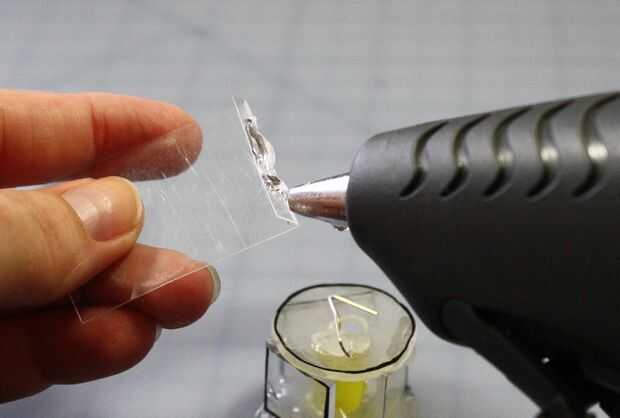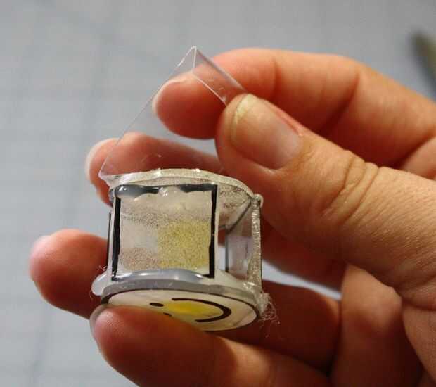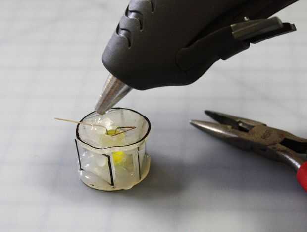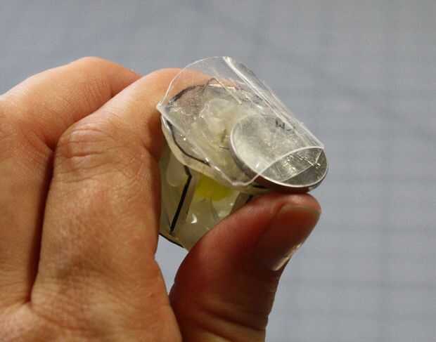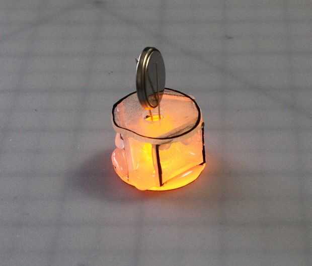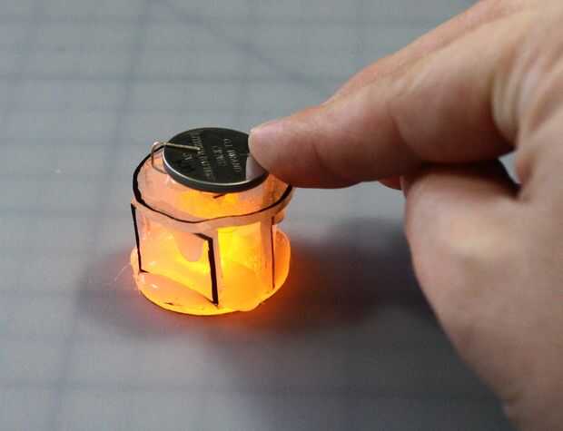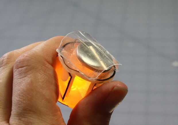 En este punto, basta con deslizar una pila de monedas entre las patas del LED y cinta adhesiva en su lugar, o usted puede construir una ranura para sujetar la batería. Ver las fotos de mi método para hacer un bolsillo de la batería. Usé los alicates para doblar la pata negativa del LED por debajo y su positivo en la parte superior un espacio para la batería. Ya que necesitaba para que la pata positiva llegar a la parte superior sin tocar el fondo de la batería y el circuito se ponga en cortocircuito, usé un poco de pegamento caliente para aislar la parte de la pierna. La bolsa se completa con pegado en una pequeña franja de tundir plástico para mantener la batería en su lugar. Pop la batería para encenderlo, pulse volver a apagarlo. Si usted viene para arriba con otro método, por favor comparta en los comentarios, o en su propio instructivo.