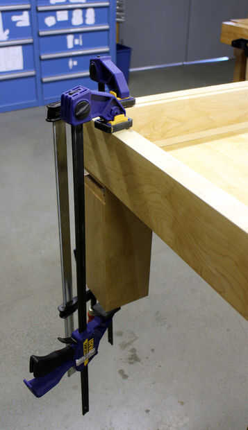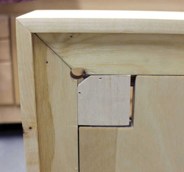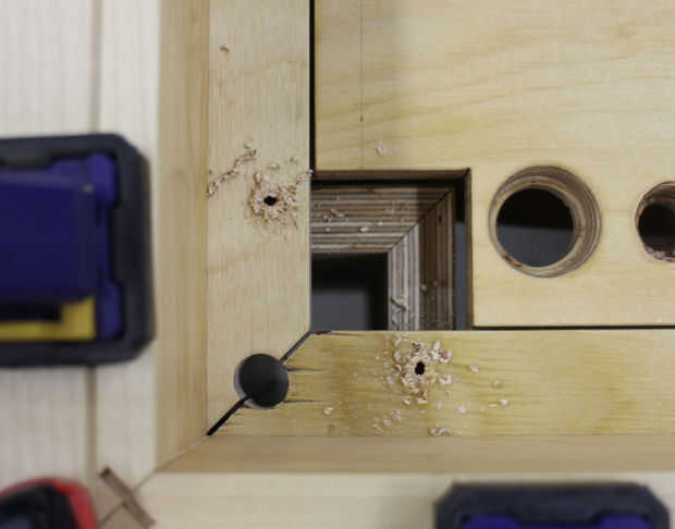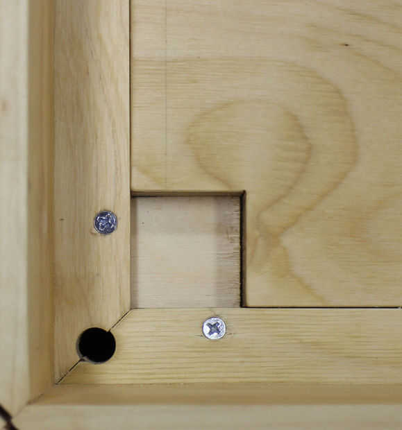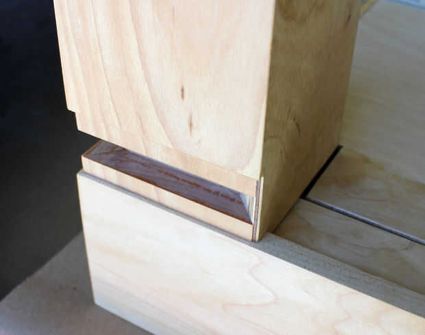 Las piernas encajan firmemente en las esquinas de la parte superior del marco. Tuve un pequeño espacio entre la superficie de las piernas y la parte superior del marco, que llené usando un trozo de madera contrachapada de 1/4". Taladrar los orificios piloto primero, viró la madera utilizando clavos y finalmente une las patas con tornillos.
