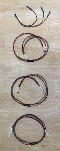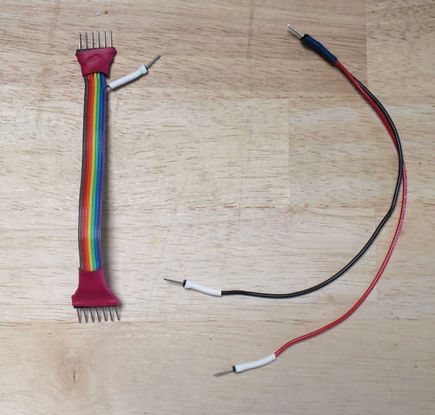 También hice un siete cables similares de diferentes longitudes (3", 3", 5", 6", 9", 12", 15"), con tres separados solo-perno cabezales macho y un conector hembra de 3 pines en el otro extremo. Estos eran para enchufar las tiras de la placa de circuito.