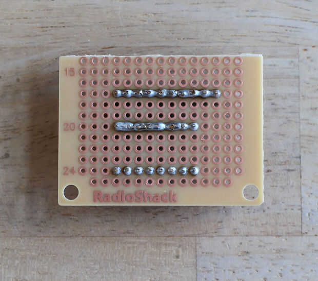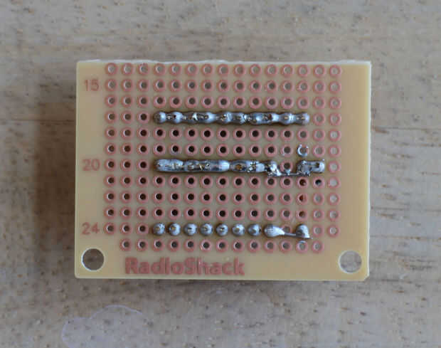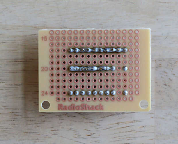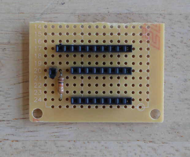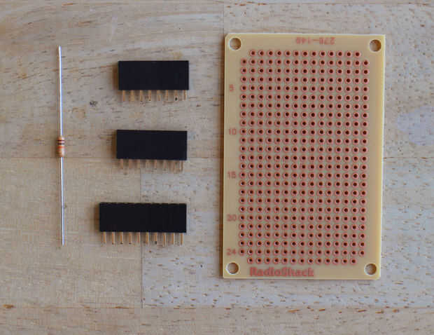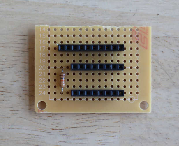 La placa de circuito principalmente une los cables, en lugar de que contiene componentes eléctricos, pero me pareció más fácil que intentar combinar todos los cables sin él. El componente de encabezado no sólo es un 10K ohm desplegable resistencia utilizado en el circuito para leer el estado del botón.