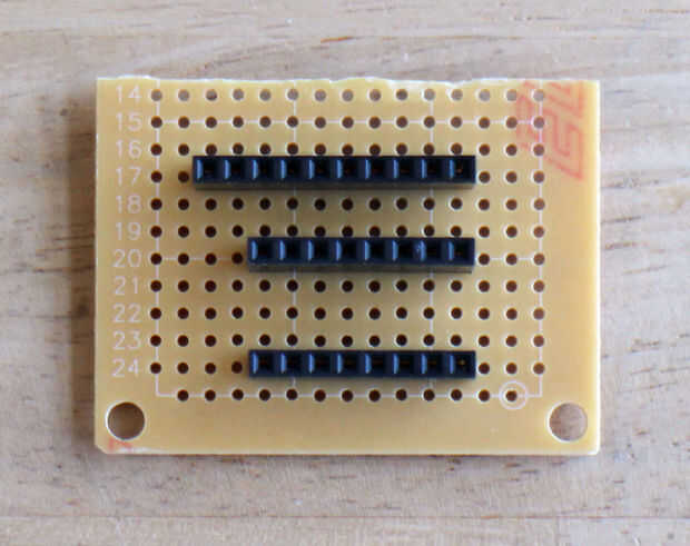 Todas las cabeceras en él son mujeres. Tiene diez pernos conectados a la alimentación (siete para las tiras de LED, para Arduino, uno para el botón y para el interruptor y poder llegar) y nueve conectado a tierra (siete para el LED las tiras, una para el Arduino, uno para la tierra de las baterías). Hay dos conjuntos de siete cabeceras para las señales de LED desde el Arduino y las señales de LED a las tiras.