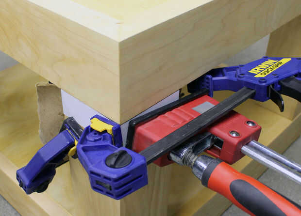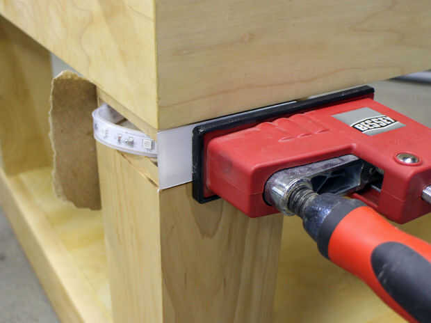 Usé una versión clara de Liquid Nails pegamento para fijar los paneles de acrílico a las piernas. Por desgracia, fue un proceso desordenado y seca rápidamente, por lo que no pude conseguir muchas fotos. He aplicado el pegamento a la madera a ambos lados de la tira de LED y presionado rápidamente en el acrílico con el chorro de arena hacia la madera. Cuando fue alineado llevó a cabo en lugar con una pinza (o abrazaderas de dos, si tuvieran una pequeña área de sujeción). Luego une el panel de acrílico del mismo modo y dejar que seque durante la noche.