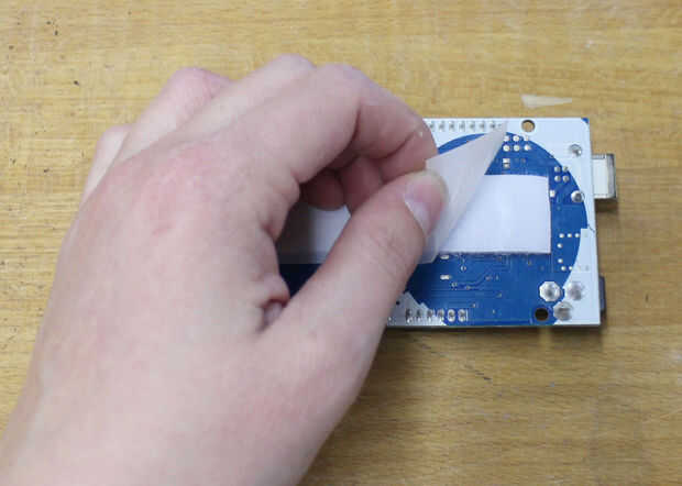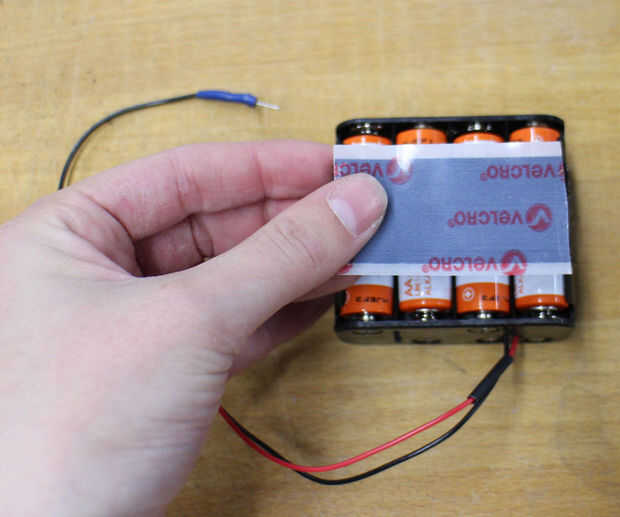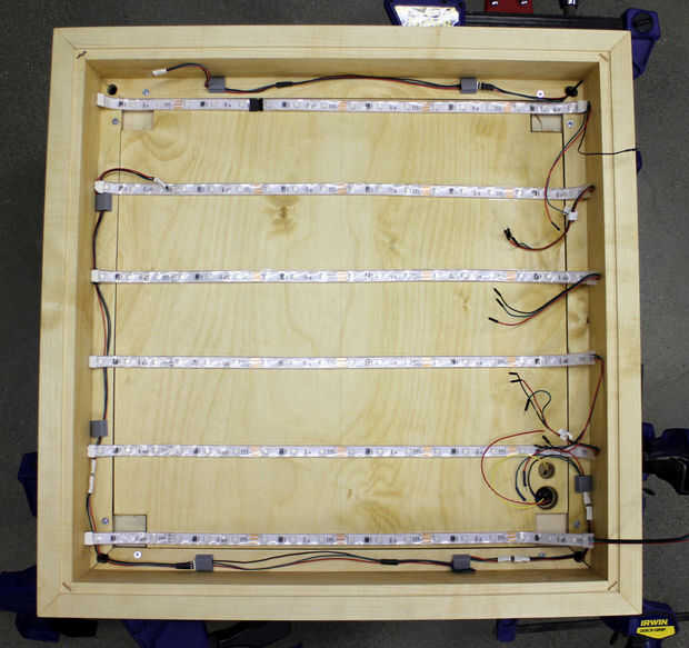 Una vez que se completaron las piernas y secado, añade la electrónica en la parte superior. Dibujé las líneas de lápiz de luz que indica donde deben ir y poner las tiras de más o menos en su lugar con cinta de pegar (los divisores tienen muescas para las tiras de modo más cuidadosamente pueden alinearlos entonces) las tiras de LED. También había marcado los lugares para el Arduino y las pilas y utilicé velcro adhesivo detrás para garantizar a la madera.